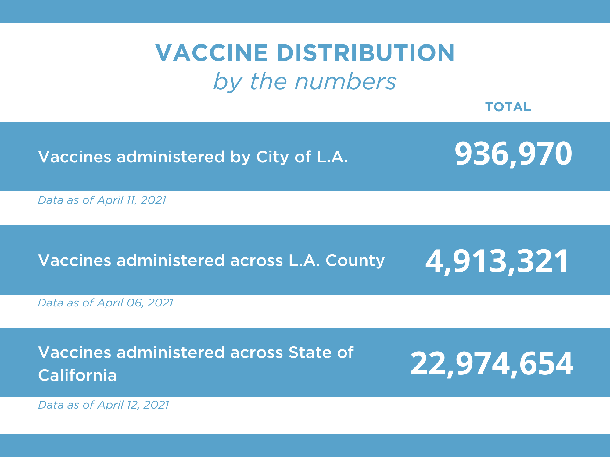 BY THE NUMBERS: The City of Los Angeles has administered 936,970 vaccine doses at our City-run vaccination sites and mobile clinics, skilled nursing facilities, and fire stations. Since last Monday, our centers have provided 87,764 life-saving vaccinations.