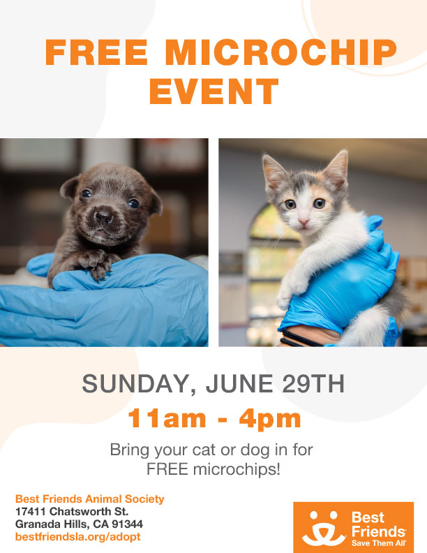 Microchips are a permanent form of ID that greatly increases the chance of a happy reunion if your pet gets lost. Visit any of LA’s six Animal Services Centers — open Tuesday through Friday from 8 AM to 5 PM and weekends from 11 AM to 5 PM.