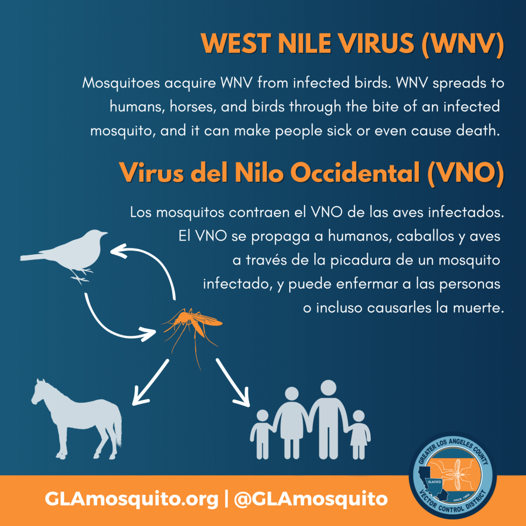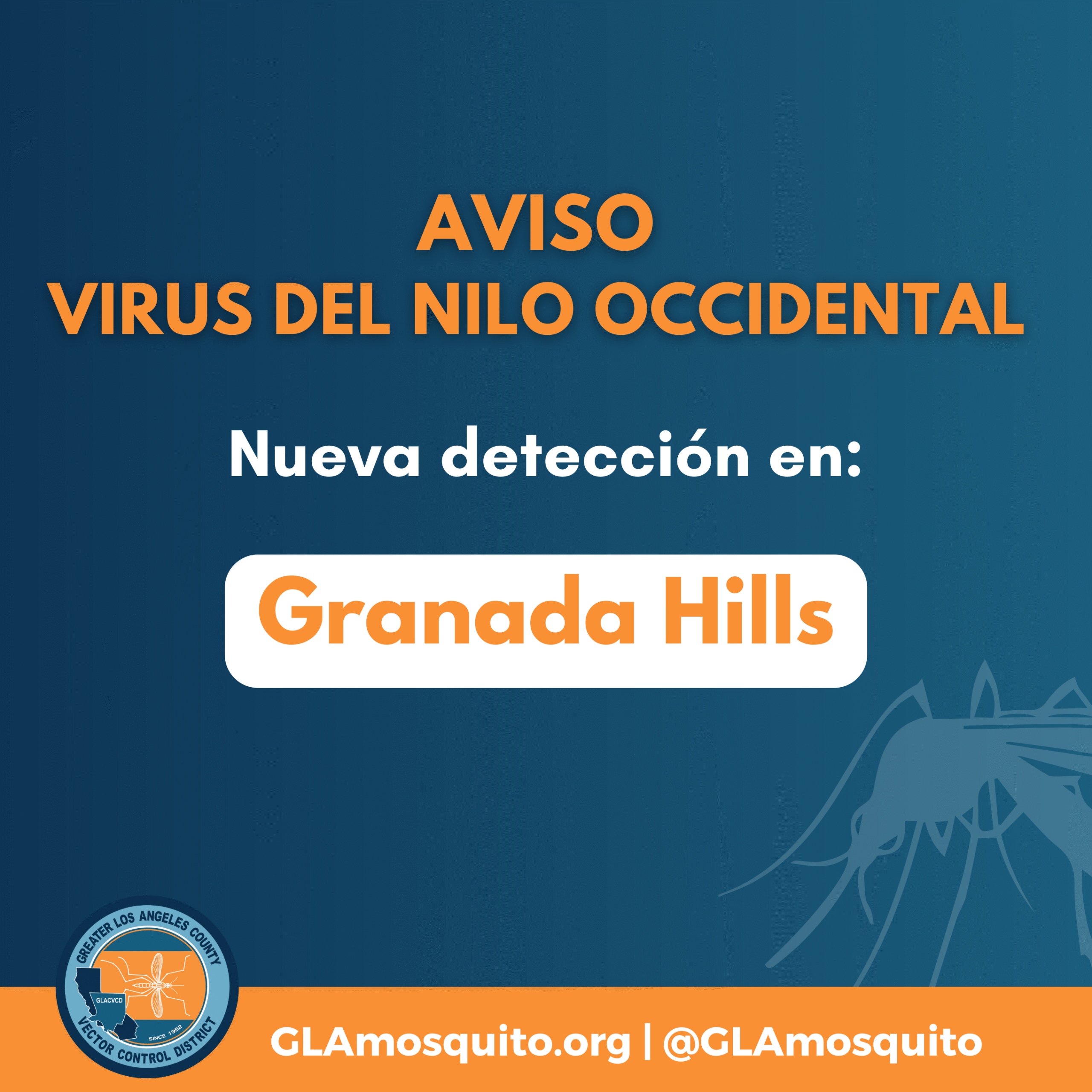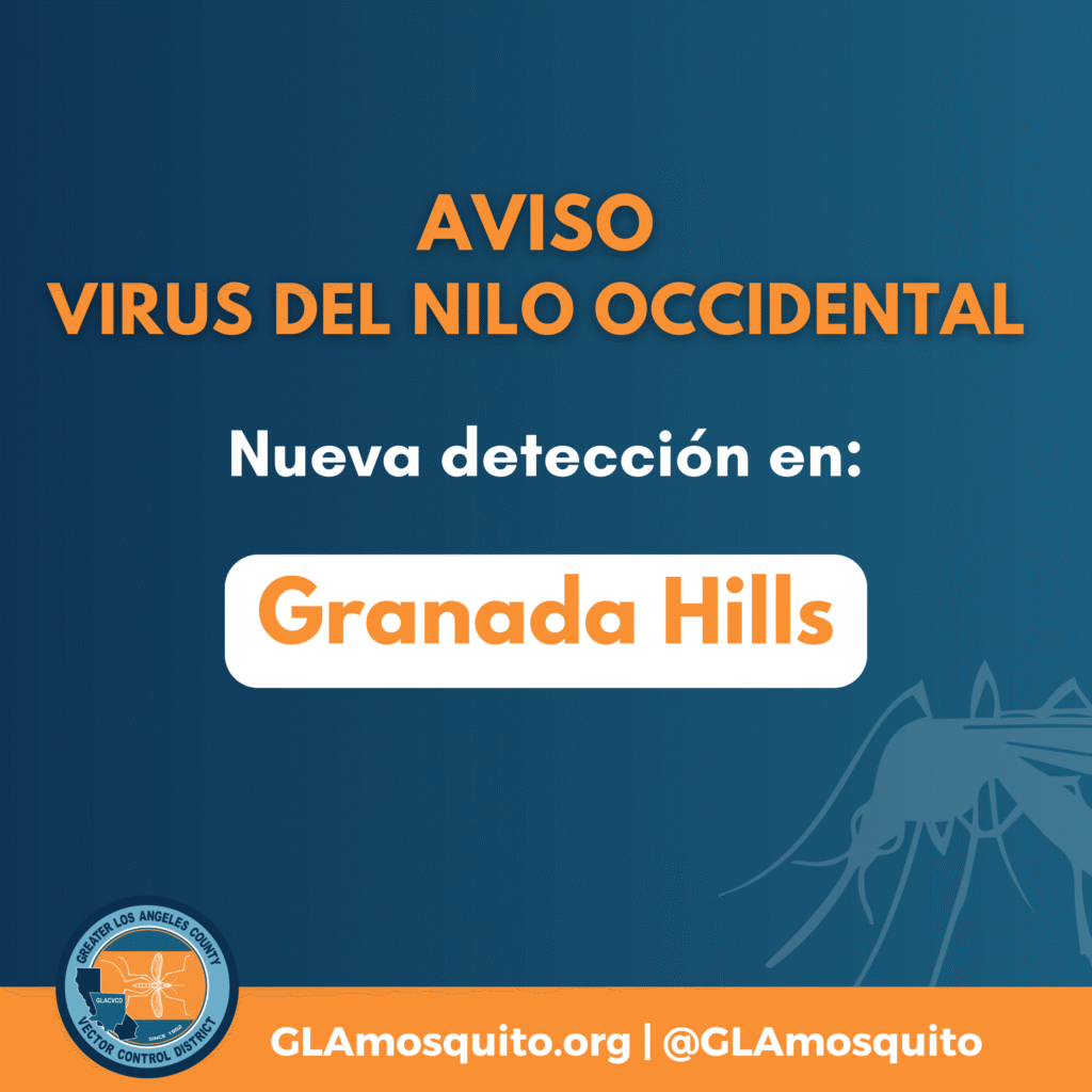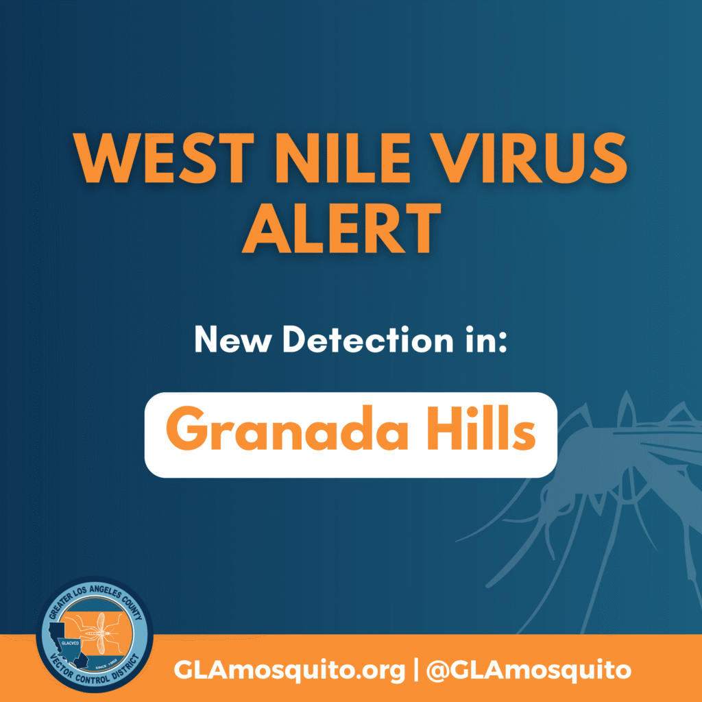 The Greater Los Angeles County Vector Control District (GLACVCD) has confirmed the first mosquito sample to test positive for West Nile virus (WNV) in Granada Hills this year. This positive sample was detected in mosquito traps in your community on July 22. District staff have placed notices in public spaces (e.g., parks, etc.) within a half-mile radius around trap locations to advise residents to take precautions when mosquitoes are present. To support these efforts, we have attached graphics that can be posted on social media and other communication channels to spread awareness.